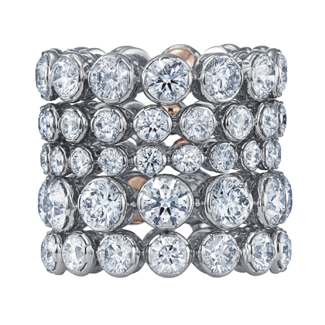 〈ボレロ〉キーダイヤモンドをひと粒毎に丁寧に覆輪留めを施した究極のフルエタニティリング。カシケイならではの美しい輝きを損なわず、5 タイプのサイズデザインを重ね付けて愉しむことができます。