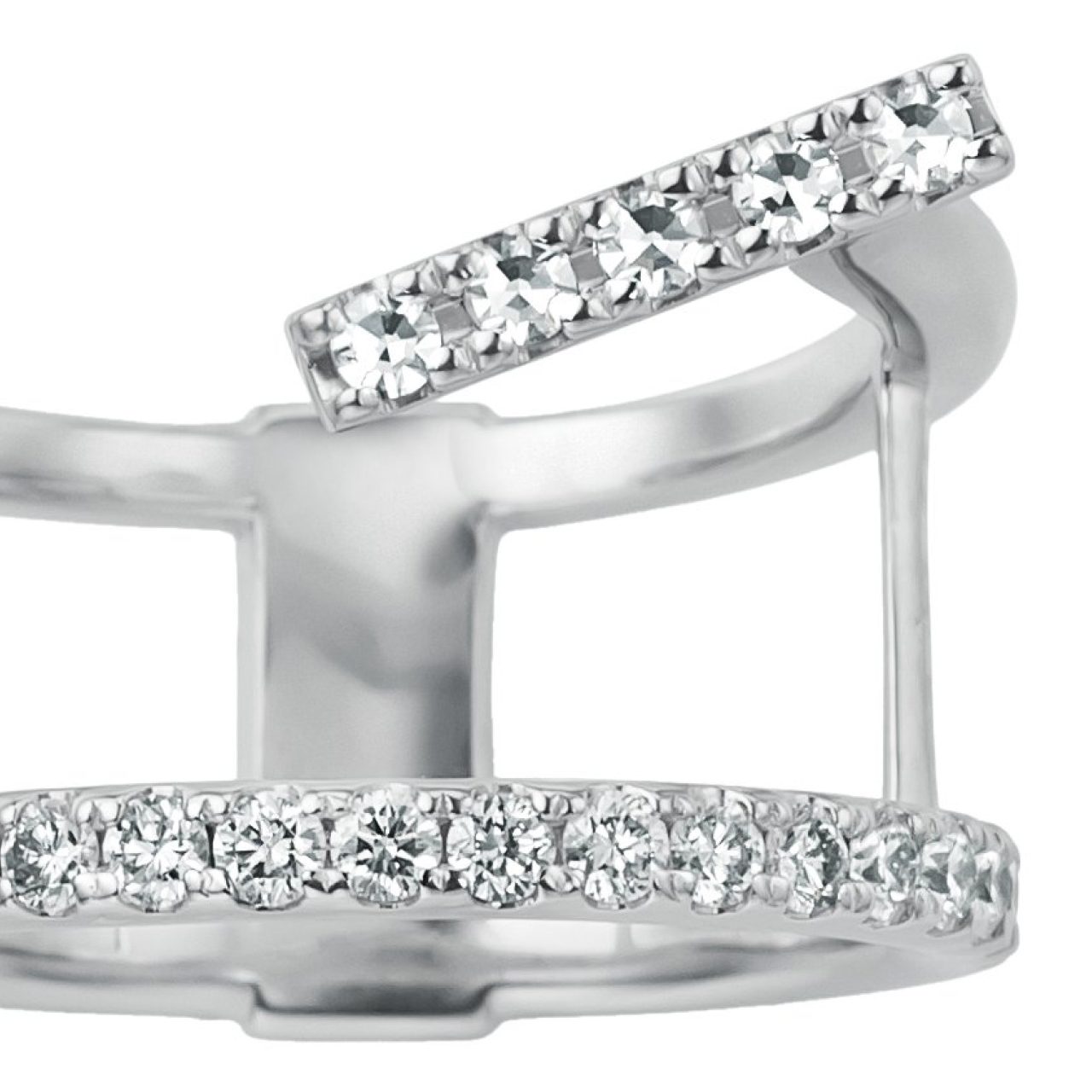 〈デュタン〉シンプルでエッジのきいたデザインは見る人に鮮烈な印象を刻み、個性を主張したい人の心を満たして、その輝きを知的かつ大胆に増幅させます。重ね付けでは輝きの協奏も。シングルカットとラウンドブリリアントカットの二つの輝きが時を超えて調和します。モードを愛する人の静かなる主張に。